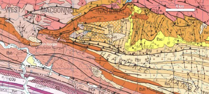 The spectacular geology and landforms of the MacDonnell Ranges in Central Australia are graphically revealed in Ormiston Gorge, which cuts some 300 metres deep through a high ridge, around 135 km west of Alice Springs.