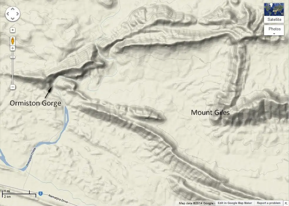 The creek enters Ormiston Gorge flowing west and changes direction in the gorge to flow south. Downstream of the gorge the creek flows through the rocky ridges that run in an east-west direction. These deep gashes across the rock ridges are called water gaps, narrow gorges that the creeks now run through. There are many water gaps in Central Australia, some of which are clearly visible in the Google Earth image above.