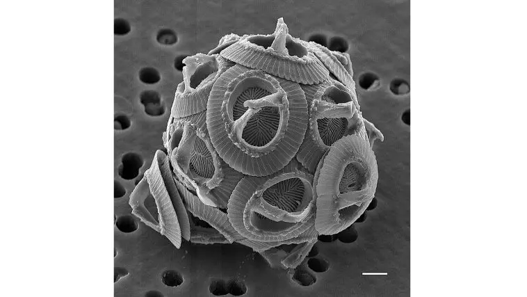 The picture shown above is of an ocean-dwelling microscopic organism known as a coccolithophore. It makes its own food via photosynthesis, and it also makes the “plates” that you see covering it. It makes them by absorbing bicarbonate (HCO3–) and calcium from ocean water and making calcium carbonate (CaCO3). When coccolithophores die, their calcium carbonate plates sink to the bottom of the ocean, making deposits of chalk.