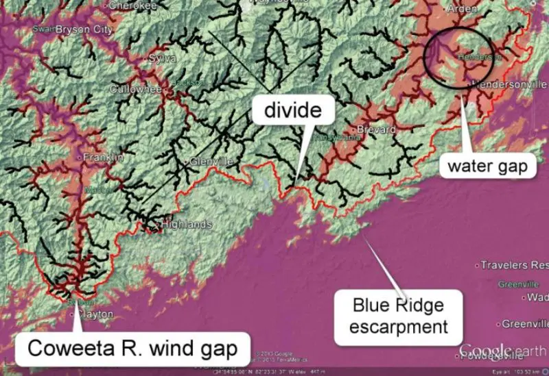 A simpler explanation would be that, as the landscape emerged from inundation (during Noah’s Flood), water currents caused the erosional gap. As they subsided, the flow divided into two currents, one flowing toward the Mississippi and the other to the Atlantic, leaving this and other features such as water gaps in their wake (see circled areas in the second image). The knickpoint retreat referenced in Gallen et al. could have been caused by a sudden steep base level fall as emergence continued, followed by a standstill as the majority of floodwaters reached the Gulf of Mexico. After that, normal stream erosion would have taken over.