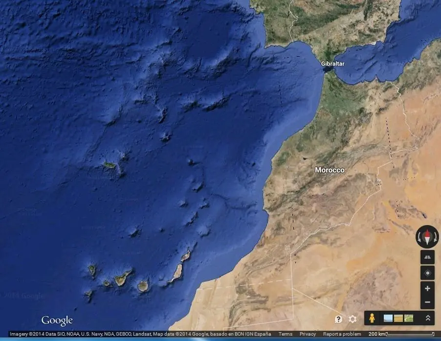 On Google maps, you can see the islands sit off the west coast of Africa, with a similar volcanic chain to the north running toward Spain, but mostly submerged under the ocean. You can see that the islands stand out as separate cones above the ocean floor and that they have steep sides. This suggests that the islands are of volcanic origin and that eruptions occurred after the ocean crust was in place. You can see that the islands have flat tops, and this suggests their landscape was smoothed flat by the ocean, and that they erupted when the water level was higher.