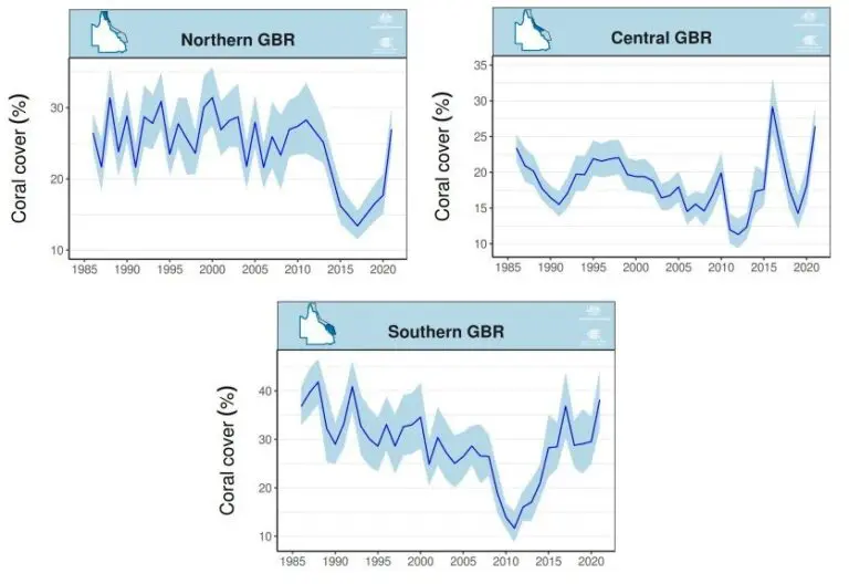 The blue lines represent the percent of the area that is covered in coral, and the light-blue shading represents the uncertainty in that value. Notice that in each part of the Great Barrier Reef, there are times when the coral coverage is high, and there are times when it is low. Sometimes, the coral coverage is very low. Nevertheless, right now, coverage is nearly as high as it has ever been.
