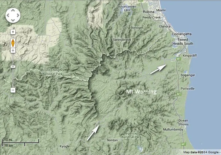 Google maps (figure 2) provides a good view of the present landscape around the volcano. (It covers an area 100 km east-west and 70 km north-south.) As Mt Warning was erupting, it delivered black basaltic lava to the land surface (likely underwater) at an enormous rate, lava that flowed at least 30 km in all directions away from the vent. You can see the extent of the lava flows on the map, as they radiate from the centre like long thin branches.