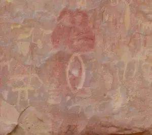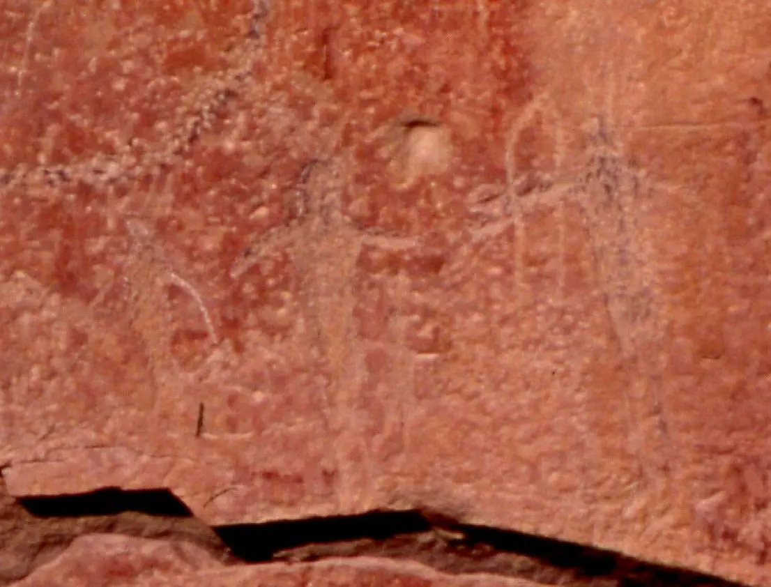 This image even has an open mouth. It may be another sauropod dinosaur. If so, there are five dinosaur images made by Native Americans on this small area of the main panel at Sego Canyon.