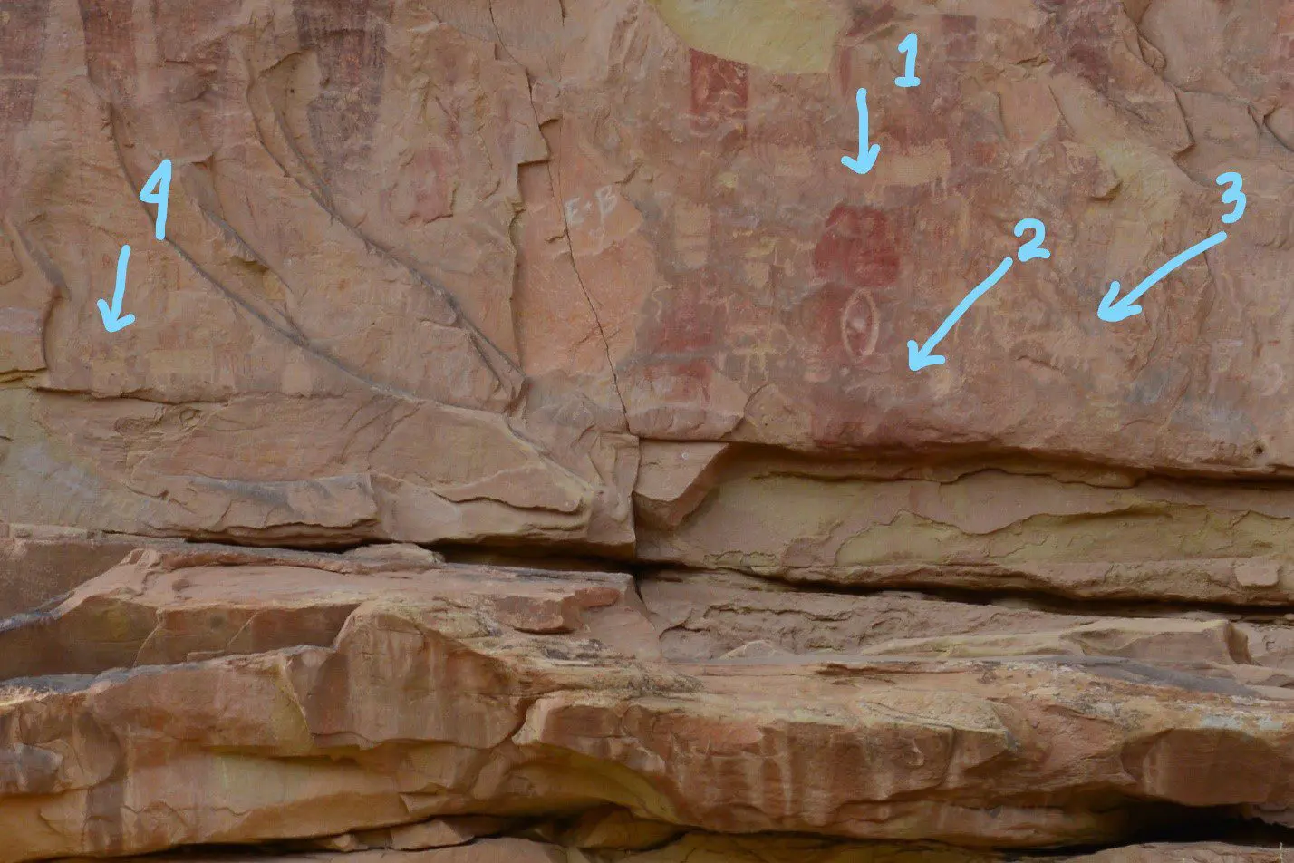 Note that in the photograph above, the 1884 graffiti has not faded much, while the Native American images have faded. This is one of the clues used by professionals to estimate the age of the images. They are clearly hundreds of years, perhaps a thousand years, older than the graffiti. The chipped images are chipped through the painted images, so they are more recent yet.