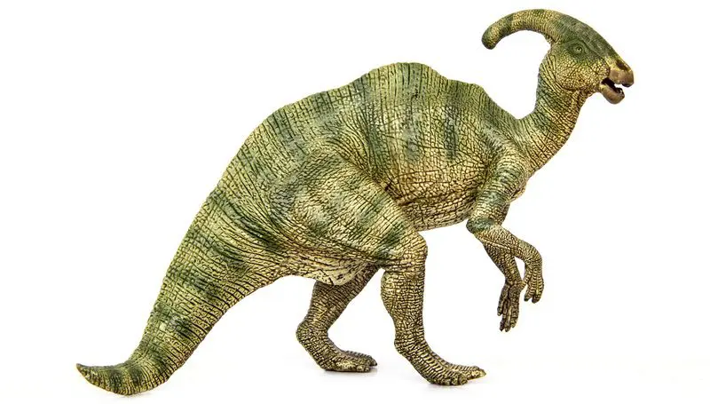 It has the right head, neck, placement of the eye, and size of body. The front legs are shorter and smaller than the rear legs, just as Parasaurolophus has. It has the curved head crest, and the bony extension above the lips. The whip-like tail was the first thing that caught our eyes, and it is the right thickness, though it is longer than the re-creations show.