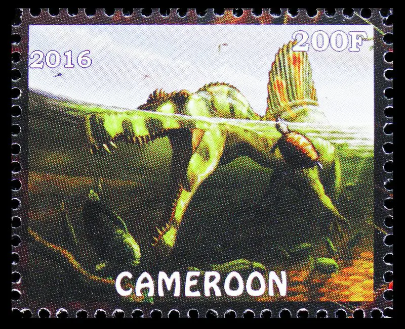 To the right, there is yet another dinosaur; this one (3) is a Spinosaurus, with a sail on the back, webbed feet, long tail, and an enormous head. This is the only known species of swimming dinosaur.