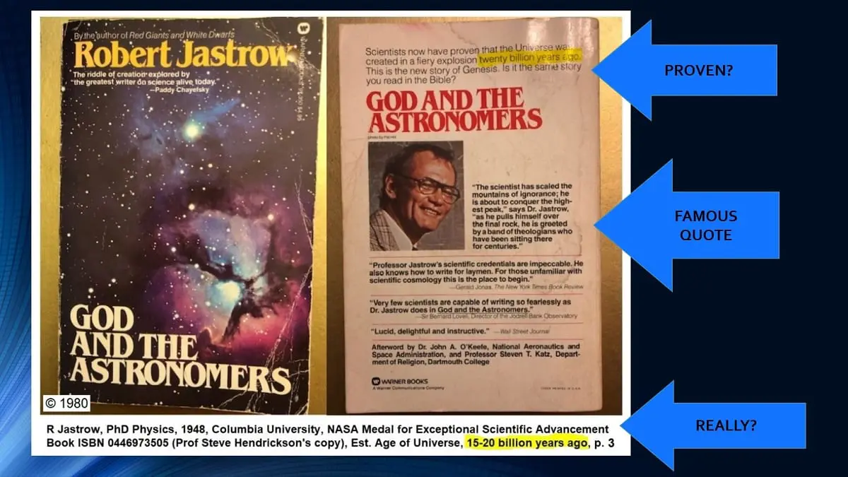 And we can see why, since the “twenty billion years ago” and 15 or 20 “billion years ago” phrases are being used in Jastrow’s book for the age of the universe and are incorrect by 1994 standards (13 BYA per “Realm of the Universe” 1994, ISBN 0030016649, p. 489) and today’s (13.8 BYA).